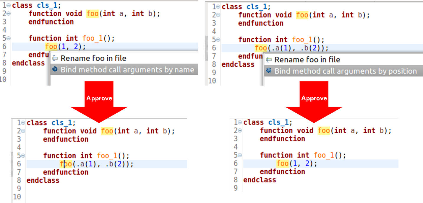 For example, Verilog and SystemVerilog let you specify module instance port connections and function call arguments by position or by name. The positional syntax is more concise, but can be confusing without explicit connections. The named syntax improves readability and it is not sensitive to argument or ports order, but it requires more typing. You might prefer to pick one style and stick with it, but conformance to your project coding guidelines may require conversion. Figure 5 shows the IDE automatically converting between the two styles.