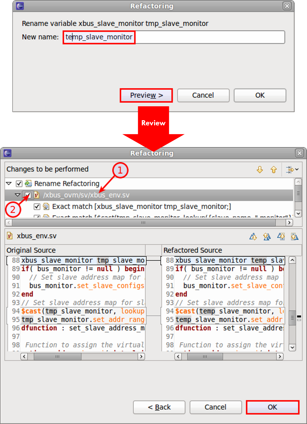 You select the element to be changed (in Figure 1, a variable) and type in the new name. The IDE lists all files subject to the name change, and you can preview the proposed edits. Once you approve, the IDE updates your files and automatically rebuilds its internal database.