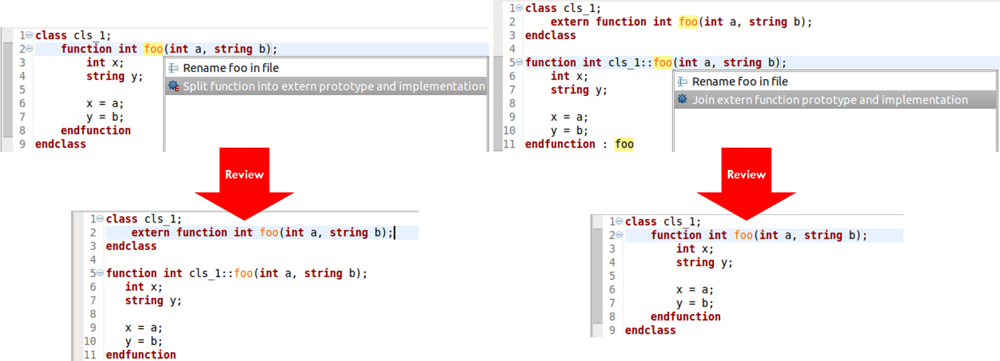 There are many cases in which you’d like to combine or split sections of code, sometimes to take advantage of SystemVerilog’s many options for flexibility. For example, you can implement a class method within the class itself or prototype it with an out-of-block implementation. The IDE can automatically reorganize the code to convert back and forth between these two options. Figure 4 shows an internal implementation split out as external and an external method implementation folded into the class. You might need to change from one to the other to make a particular verification element conform to project coding guidelines.