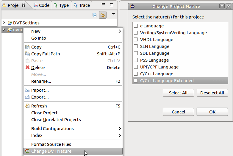 In Eclipse a project can have zero to many project natures. Various plug-ins provide functionality for a project if it is tagged with a specific nature. For example DVT builds a project only if it has one of the natures it knows about, for example Verilog, VHDL or e Language.